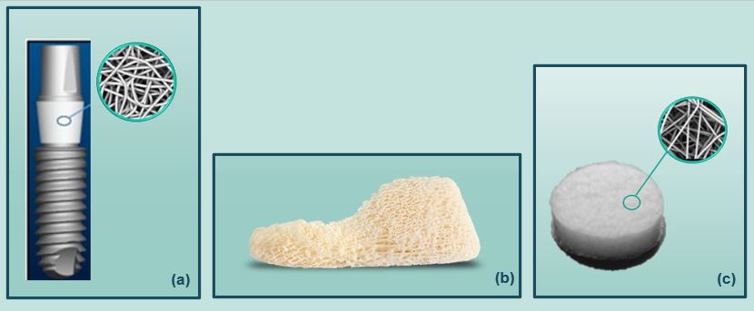 Figure : Dental implants could be coated with electrospun material to promote cell/tissue integration between implant and tissue interface (a,), and a dental plug (b) that can be made with Mimetix Air (c).